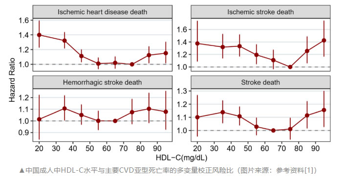 研究者在CVD特異性死亡率中也觀察到了U形關(guān)聯(lián),包括缺血性心臟病和缺血性卒中,但不包括出血性卒中。與參考水平70 mg/dL~79 mg/dL相比,HDL-C <30 mg/dL(HR 1.40,95% CI:1.23~1.59)和>90 mg/dL(HR 1.15,95% CI:1.02~1.30)的受試者缺血性心臟病的死亡風險顯著更高。同樣,對于缺血性卒中,以70 mg/dL~79 mg/dL作為參考,極低和高HDL-C受試者的相應(yīng)死亡HR分別為1.38(95% CI:1.09~1.74)和1.43(95% CI:1.17~1.74)。